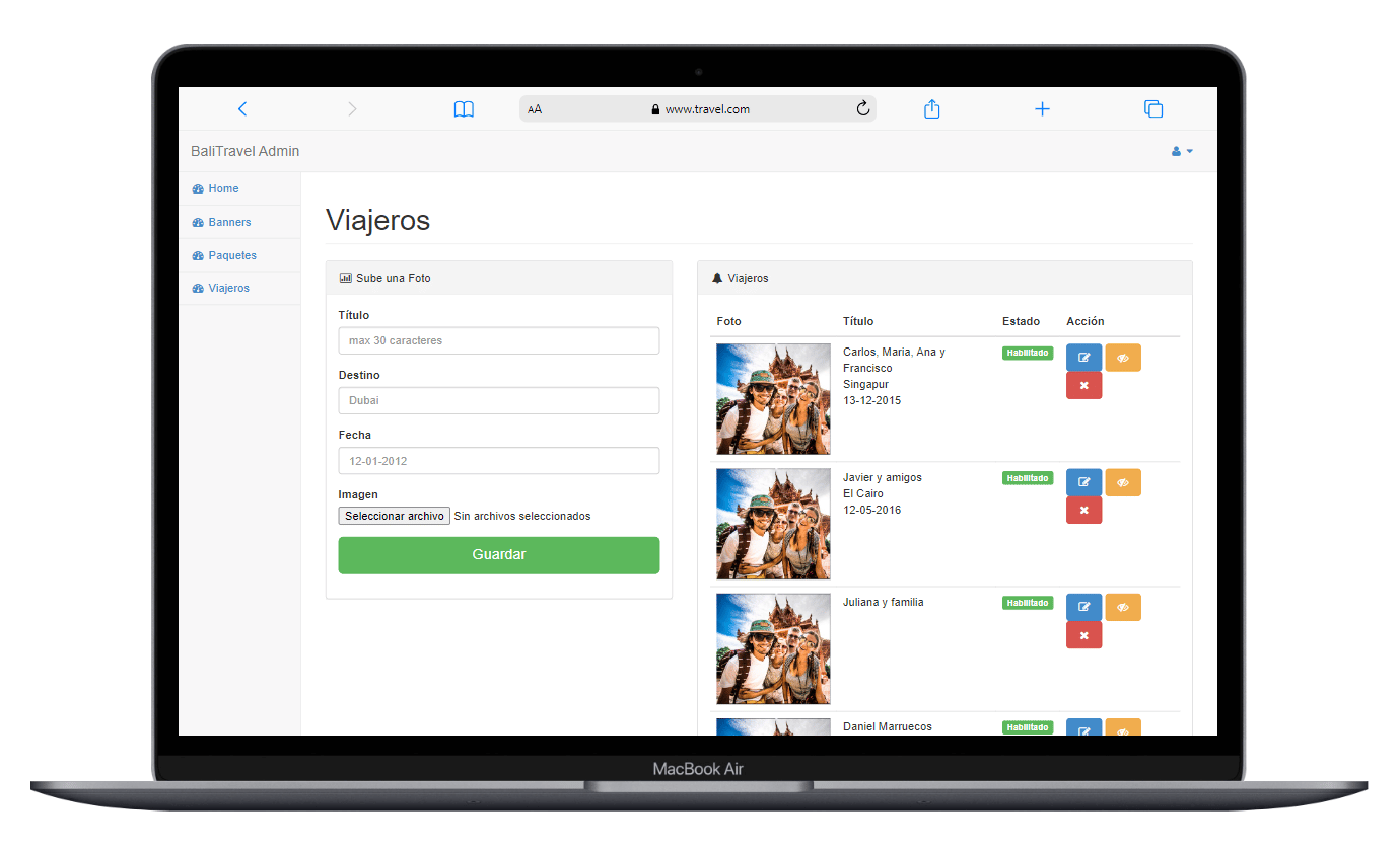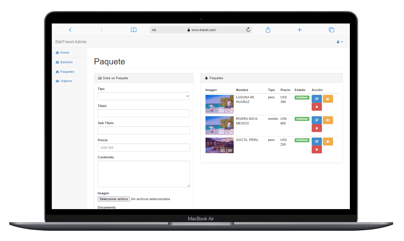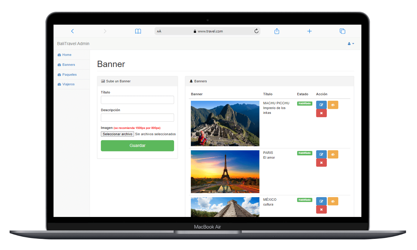 Plataforma de paquetes de viaje y turismo Travel Script es un sistema landing page que permite gestionar paquetes de viaje, además de actualizar secciones del sitio web.Cuenta con un panel de administración amigable, muy fácil de usar. Descripción Bali Travel ejemplotravelscript.com 1.12.2018 Travel Script Tecnología PHP CSS3 HTML5 jQuery MySQL Bootstrap Compartir